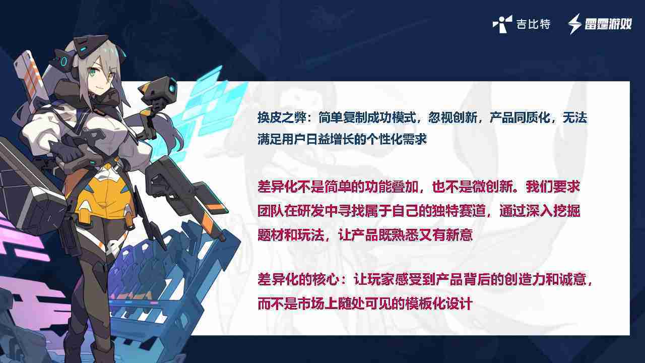 在我们内部是这么定义差异化的。。。。首先,,,,差异化不是简单的功能叠加,,更不是换皮。。。。只是换皮,,,产品无法提供有效的市场价值。。。。内部经常说差异化的产品不是为了迎合市场,,,,而是找到一个自己独特的表达方式,,,在研发中找到属于自己的细分赛道和独特赛道,,前提是需要对这个题材有足够的深入、、、、挖掘,,对玩法有足够深入的理解,,,让产品看起来既熟悉又有新意。。。。