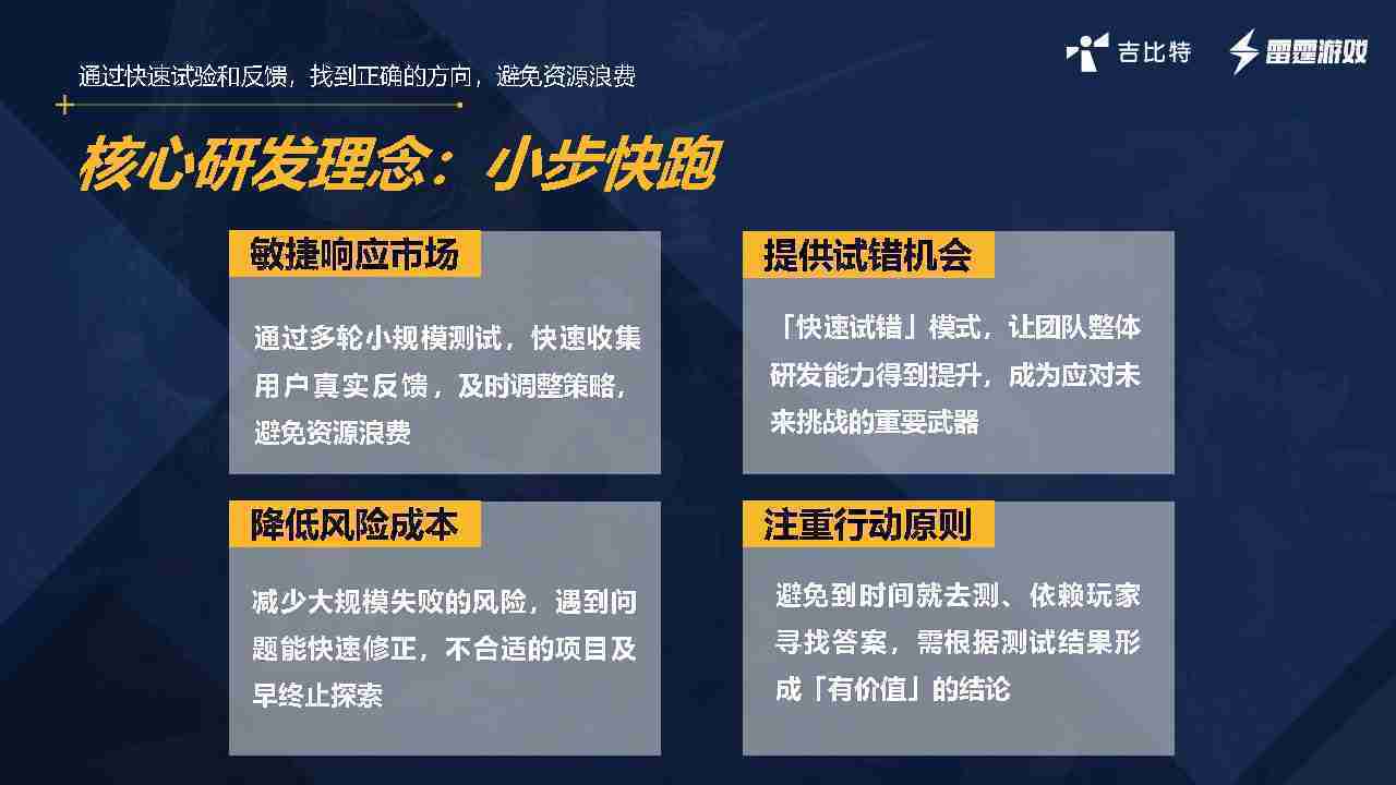 从目前的实践来看,,,内容向确实不合适,,,,因为小步快跑更适合做玩法的尝试,,但是如果是内容项,,玩法已经确定的,,这时候应该做切片,,,,而不是做小步快跑的方式,,,,因为做切片的成本是很高的。。我们有过两个项目,,要花很长时间做切片的内容,,,,而切片内容只占整个项目的1/10,,,但要花的时间成本、、人力成本、、经济成本可能会到1/3,,,,所以用很短的时间做游戏的原型,,,验证其好不好玩,,,是想尝试在粗糙表达的情况下,,,看看能否获得非常好的留存表现。。。。如果留存表现非常好,,证明游戏内容体验是比较准确和非常好的内核,,,我们会尝试加外围内容的拓展。。