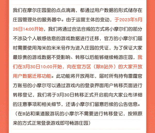 合作结束本就是开发方和代理方双方的事情,,,,降低这件事情对玩家的影响,,才是对所有珍视这段童年的摩尔玩家最好的呵护。。目前看来,,,用户完全不用担心后续因无法登录游戏而造成任何数据上的损失,,只要及时进行账号转移,,就可以好好保留、、、、延续在庄园的痕迹和回忆,,,,继续在庄园里做快乐的红鼻子小鼹鼠。。。