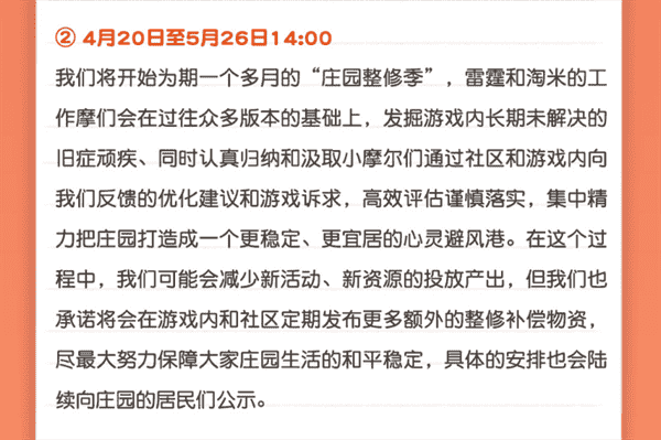 合作的结束并不意味着这个童年IP的结束,,,,对于《摩尔庄园》手游而言,,,,这是一个新阶段的开始。。后续游戏内将开启庄园重构计划,,,,会就以往遗留下来的BUG进行集中修复,,并在游戏内和社区定期发布更多补偿物资。。。。